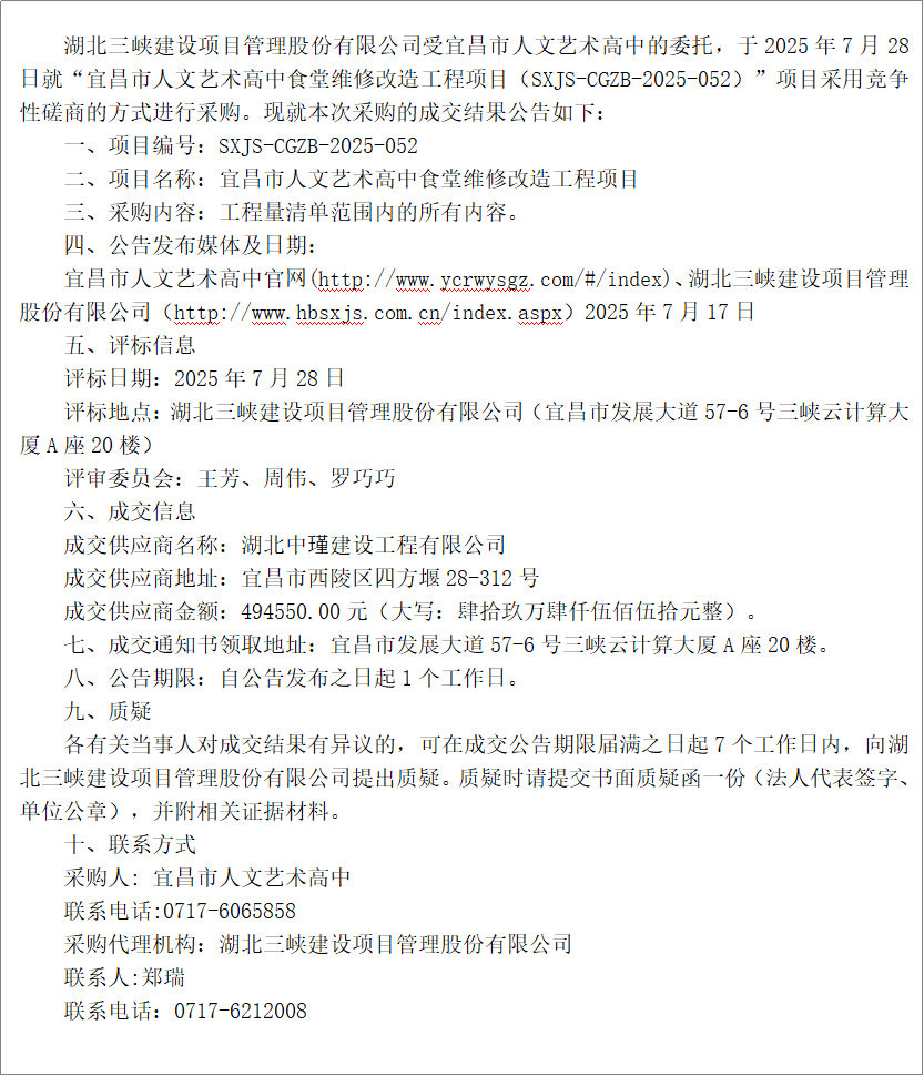 | 宜昌市人文藝術(shù)高中食堂維修改造工程項(xiàng)目成交結(jié)果公告 |
